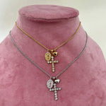 Realizzata in acciaio inossidabile, la collana Save è adornata da una croce zirconata, una medaglietta con madonnina e un cuore. Un simbolo di protezione e amore, questa collana è un must-have per ogni occasione.