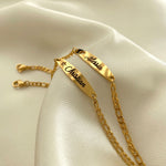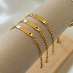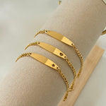 Bracciale per bimbi in acciaio inossidabile, personalizzabile con il nome o con una dedica speciale. Disponibile in colorazione gold in tre diverse varianti di modello. Il tempo di realizzazione può richiedere da 4 a 7 giorni.