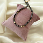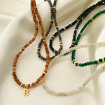 La base della collana ed i ciondoli sono in acciaio inossidabile, gli inserti oro ed argento invece sono in ematite, una materiale molto resistente ma non inossidabile. Per cui inserendo gli inserti si consiglia di trattare la collana con più cura evitando di esporla per tempi prolungati a contatto con l'acqua o il sudore.