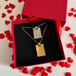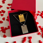 Set composto dalla box multirose con due medagliette medium realizzate in acciaio inossidabile. Colore delle collane, dimensione ed incisione a scelta. Il testo dell’incisione può essere scritto nelle note. Sacchetto regalo incluso.
